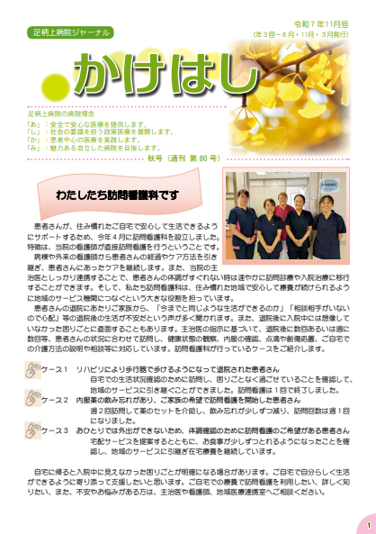 「かけはし」は、足柄上病院を利用される通院や入院の患者様およびそのご家族、地域関係機関、病院職員などを対象とした病院情報誌です。