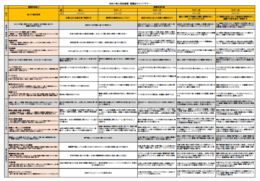 キャリアパスは、キャリア形成していく過程において、組織における教育・研修の機会を活かしながら、自分の看護師としての将来を描くための道しるべとなります。研修は看護師に必要な「専門的・倫理的・法的な実践能力」「臨床実践能力」「リーダーシップとマネジメント能力」「専門性の開発能力」の4つの看護実践能力から成り、段階を追って到達目標の難度が上がる体系になっています。